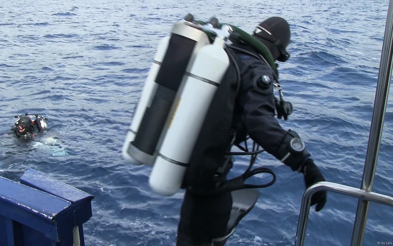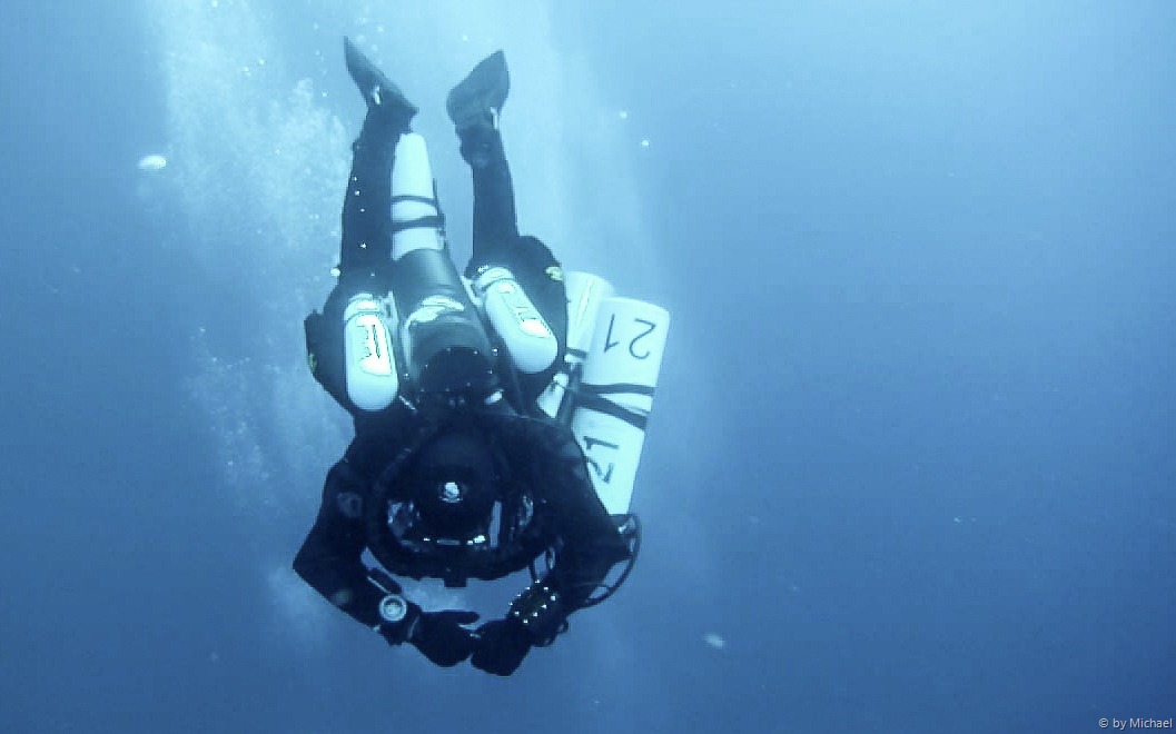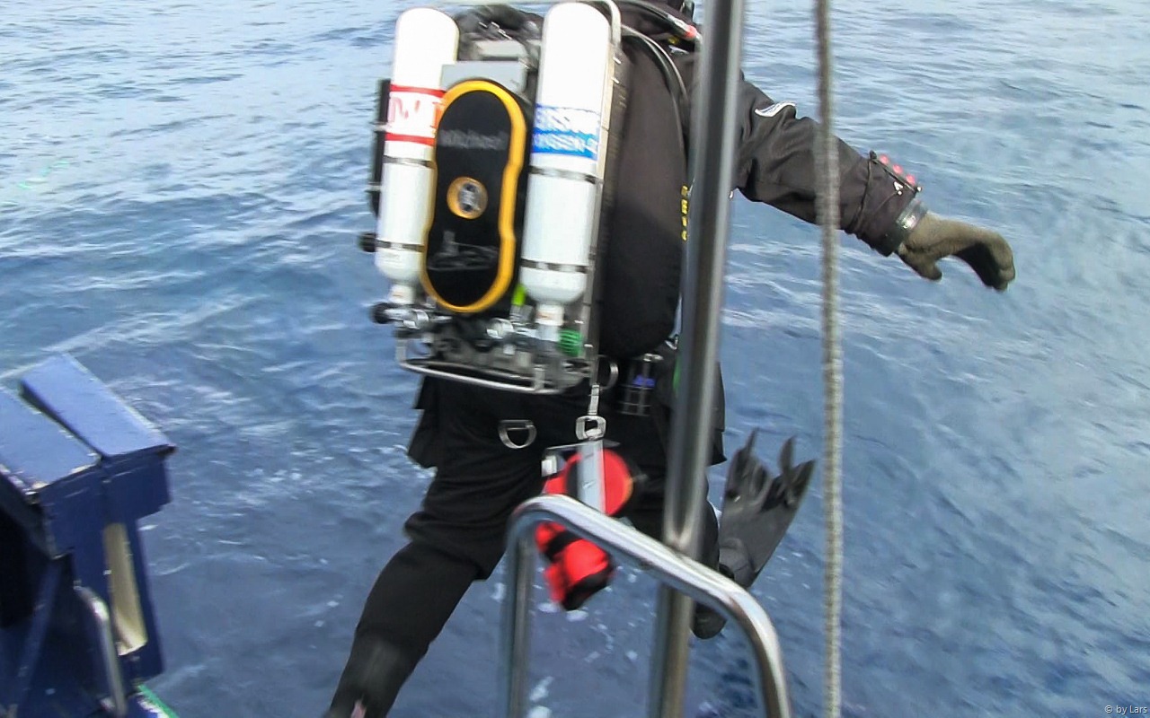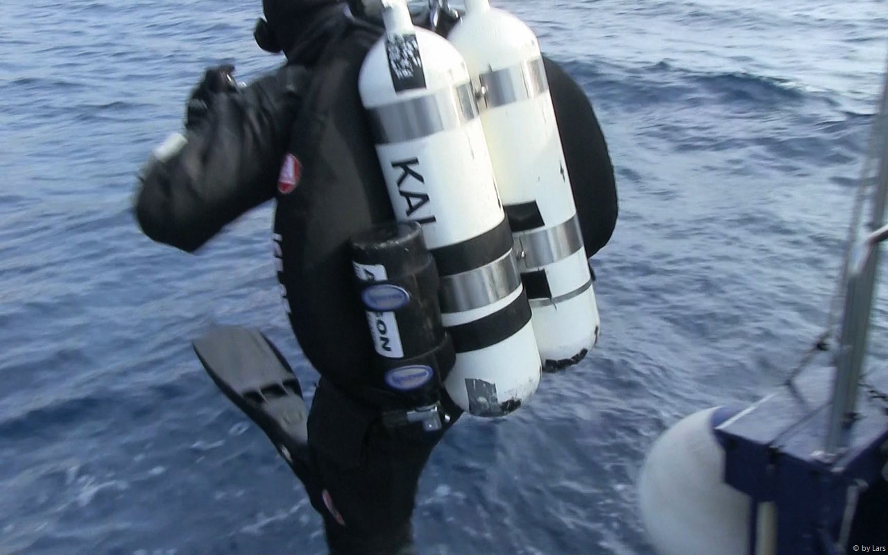 Um 11:14 Uhr springen wir mit unseren CCR wieder als erste ins Wasser. Beim Blasencheck auf ca. 10m trifft uns dann die erste Überraschung. Uwe signalisiert uns, dass sein Suex Scooter nicht einwandfrei funktioniert – mal geht er, mal nicht. Uwe