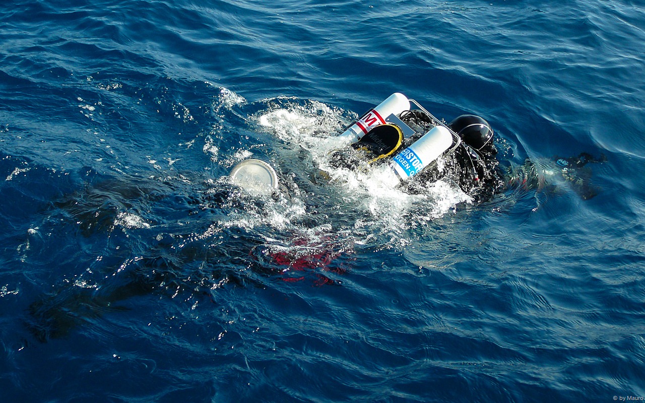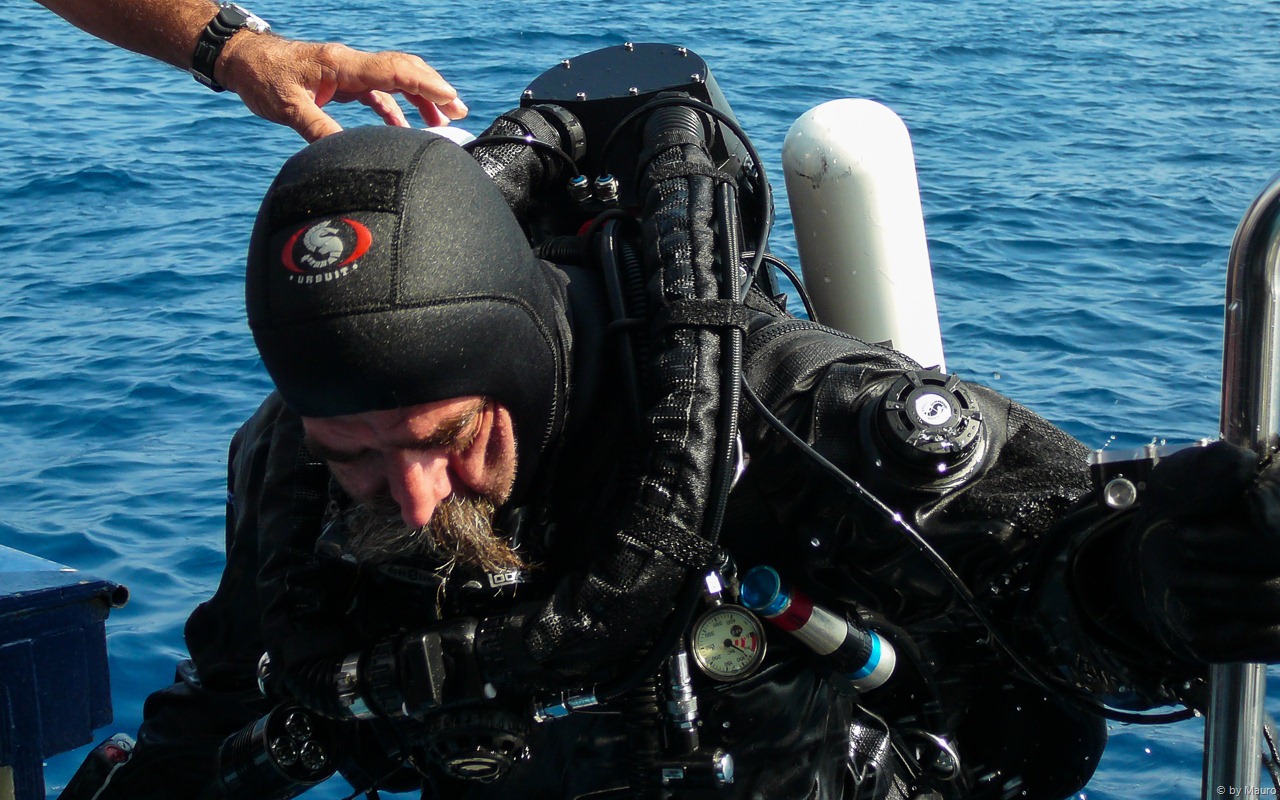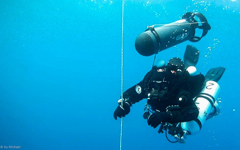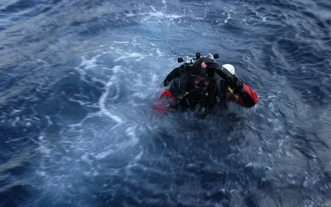 Um 11:14 Uhr springen wir mit unseren CCR wieder als erste ins Wasser. Beim Blasencheck auf ca. 10m trifft uns dann die erste Überraschung. Uwe signalisiert uns, dass sein Suex Scooter nicht einwandfrei funktioniert – mal geht er, mal nicht. Uwe