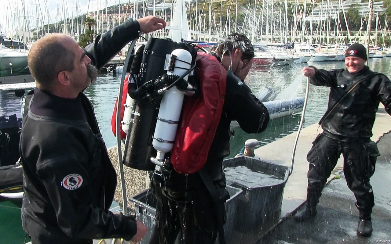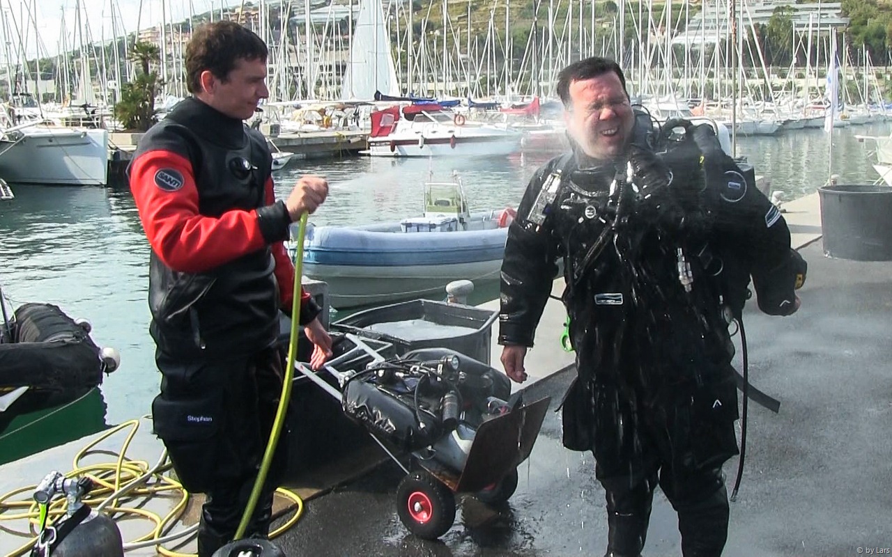 Zurück im Hafen wird wieder brav die Ausrüstung vom Salz befreit. Uwe prüft am Abend auch noch seinen Suex Scooter – er läuft, also will er es morgen noch einmal versuchen.