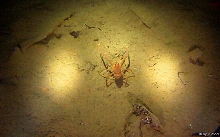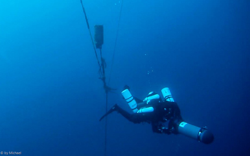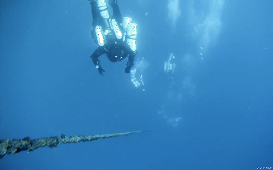 Zwei Minuten später tauchen Uwe und ich wieder an der Bojenleine ab. Mittlerweile haben uns Teile der anderen Gruppen bereits überholt. In 47m Tiefe treffen wir Volker wieder, der mittlerweile bemerkt hat, dass wir nicht vor ihm sind.