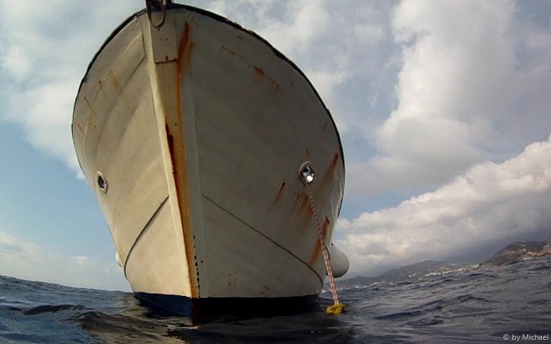 Der heutige Tauchgang führt uns bei schönem und bis zu 26°C warmen Wetter zum Wrack der Atlantide. Diese ist 1917 gesunken und liegt in einer Tiefe von 63m – 80m senkrecht auf Grund.