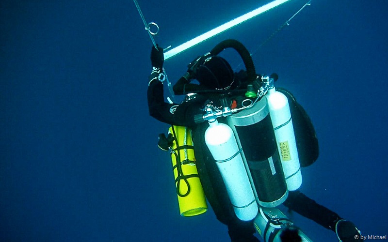 Und schon sind auch die 30 Minuten Grundzeit in ca. 75m Tiefe wieder um und wir beginnen mit dem Aufstieg. Die Guides geben ihr Bestes, um uns zu entlasten – auch die nicht mehr benötigten Stages werden von ihnen eingesammelt.