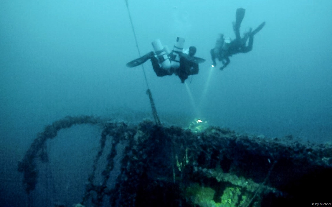 Uwe und ich kommen beim Wrack in 70m Tiefe an und beginnen endlich den Tauchgang zu genießen. Wir bleiben auf Grund des fehlenden Scooters von Uwe im Bereich der Abstiegsleine. Zuerst Richtung Heck, dann wieder vor, um das Explosionsloch mit dem Kessel etwas genauer unter die Lupe zu nehmen.