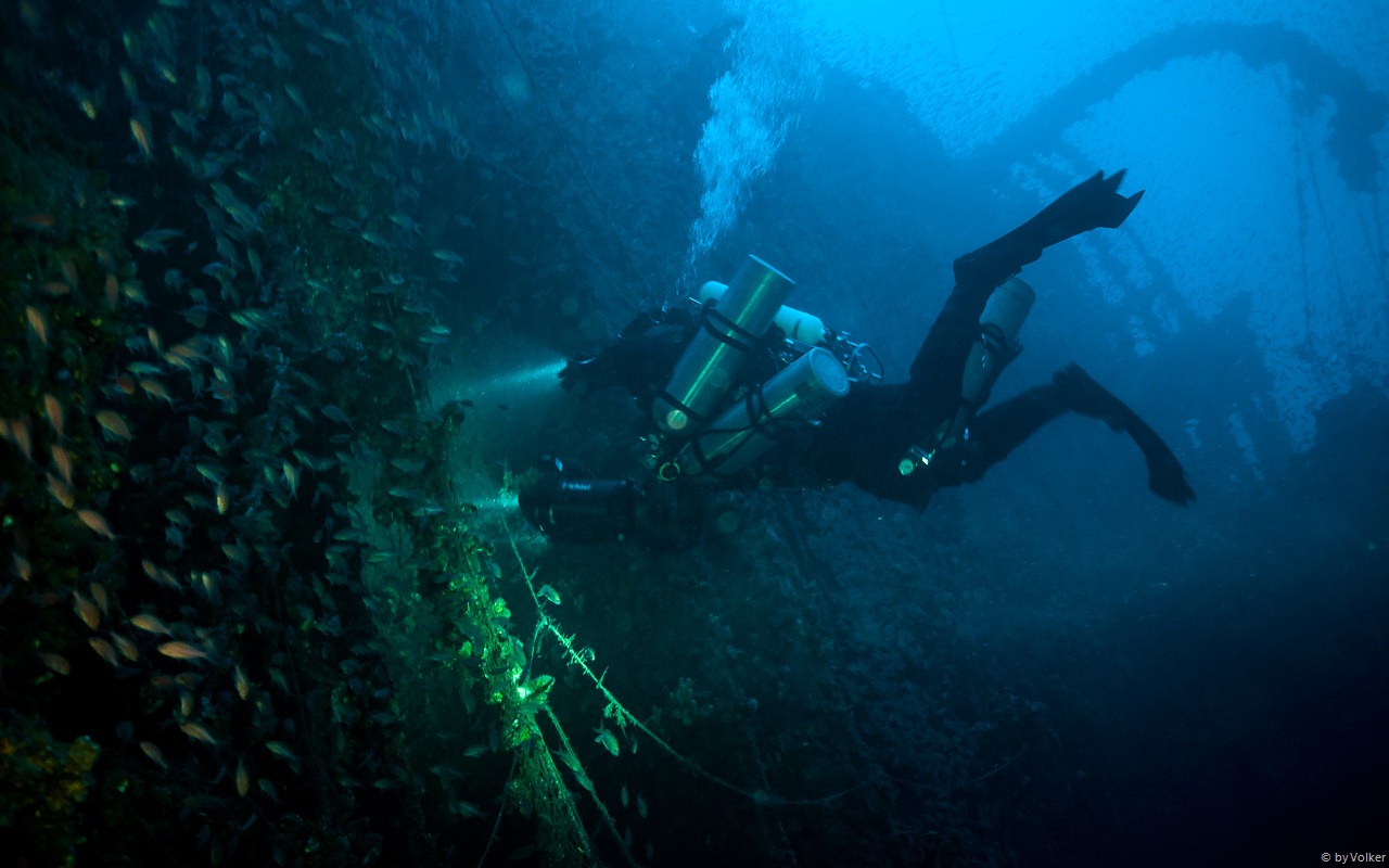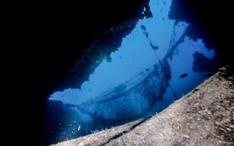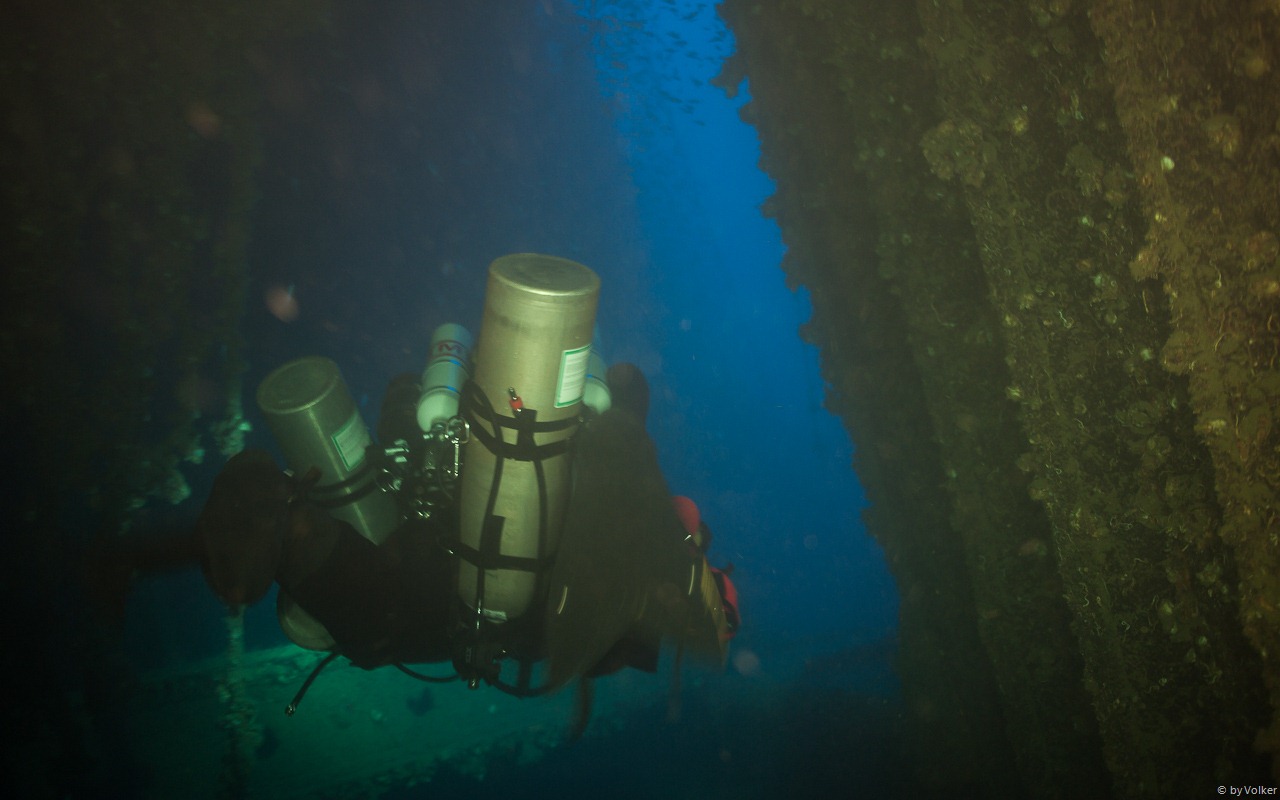 Der Tauchgang an sich ist traumhaft. Wir scootern vor zum Bug und retour, hinein ins Wrack, durch den Bauch des Schiffes durch und weiter hinten wieder heraus. Im Kesselraum durch das große Loch wieder hinein, irgendwie durchs Schiff und nochmal raus – einfach traumhaft!