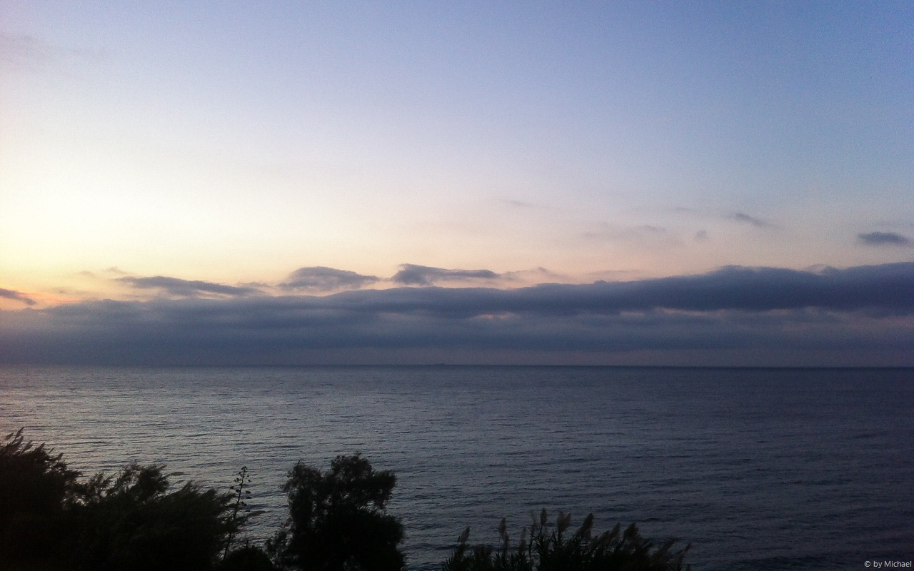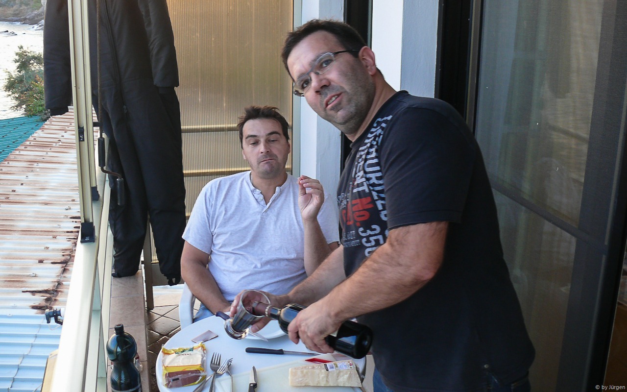 Der Tag beginnt mit einem traumhaften Sonnenaufgang, der uns beim Frühstück am Balkon der Appartements begleitet. Es gibt Kaffee, Mailänder Salami, Prosciutto und Brötchen. Dazu gesellt sich eine deftige Eierspeise von Roland – hmmm, lecker.