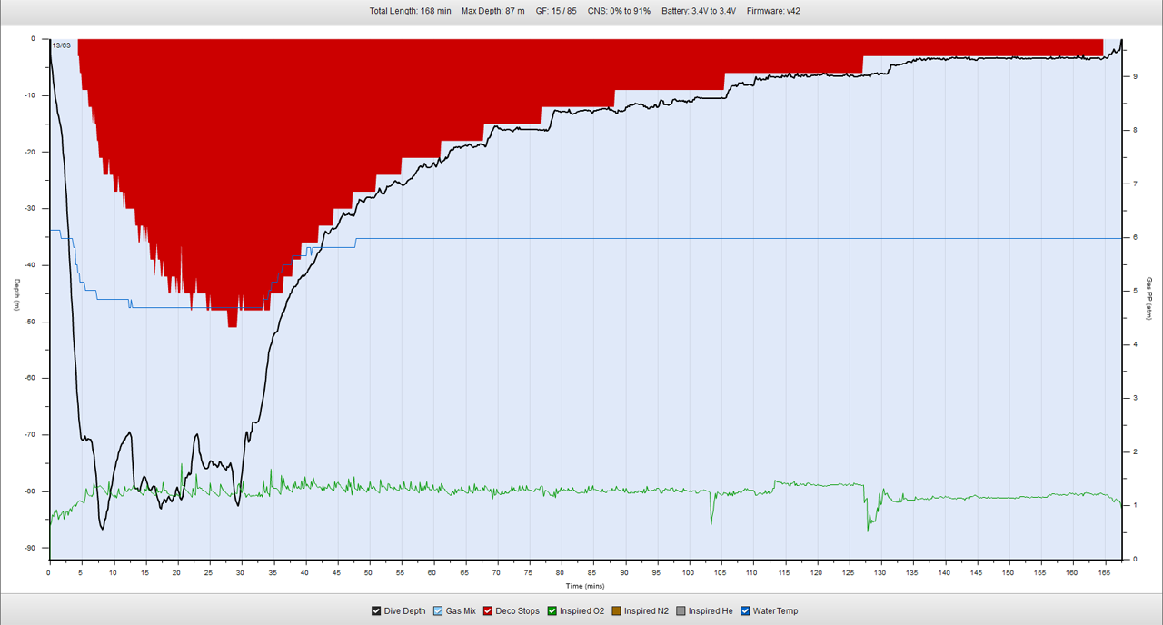 Nach etwa 23 Minuten Grundzeit beginnen wir wieder den Aufstieg. Wir haben die Runtime etwas gekürzt, um unseren anfänglichen Zeitverlust etwas zu kompensieren. Trotzdem werden es schlussendlich fast 120 Minuten Tauchzeit.
