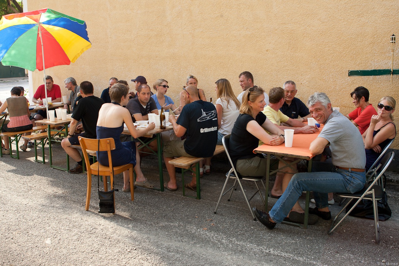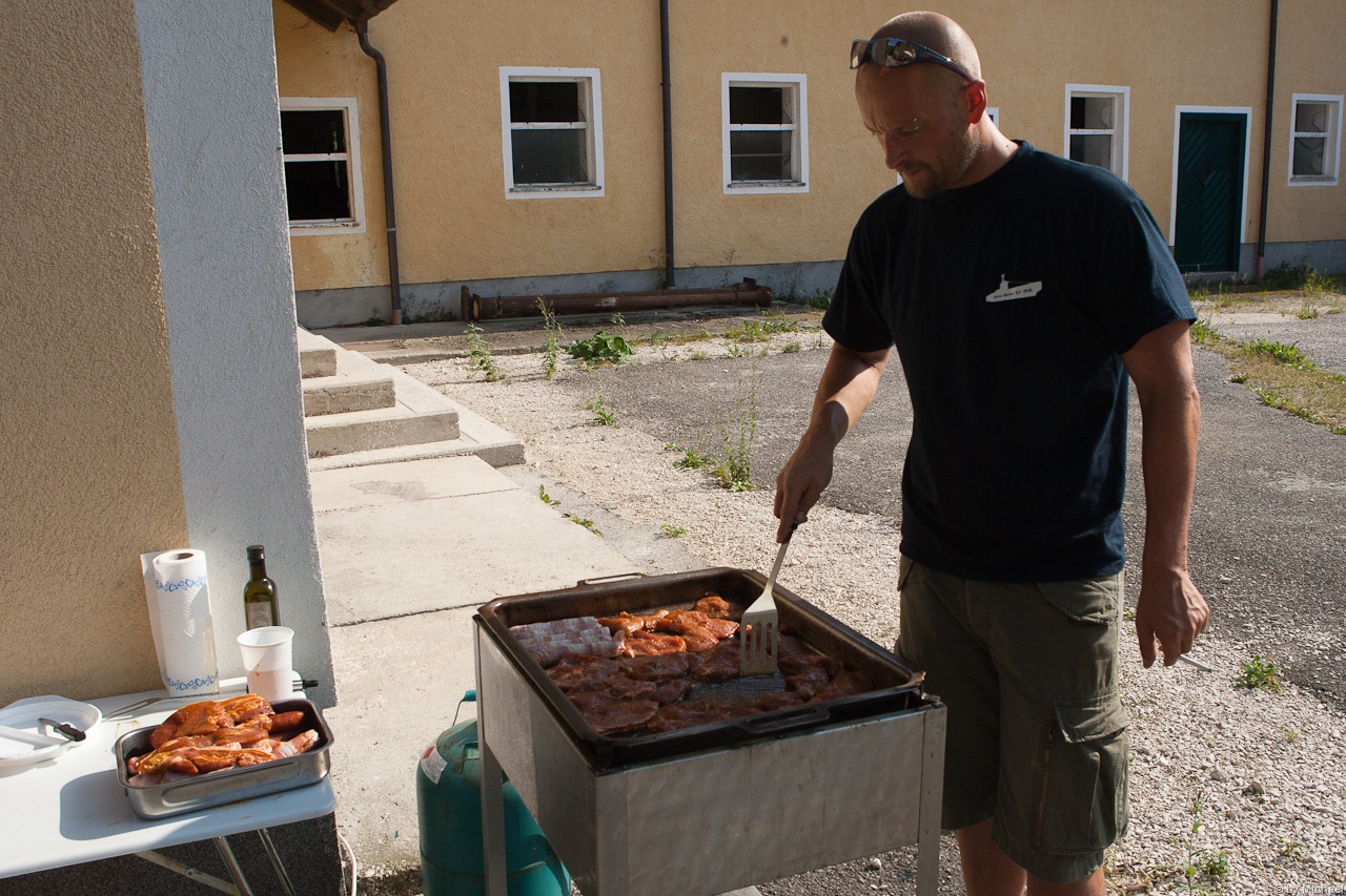 Gegen 16:30 Uhr ist Christian an der Reihe mit seinem Gasgriller. Er serviert eine köstliche Grillerei nach der anderen bis alle satt sind.