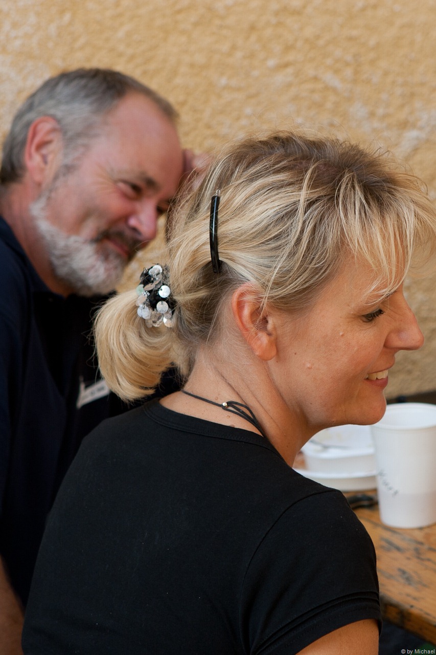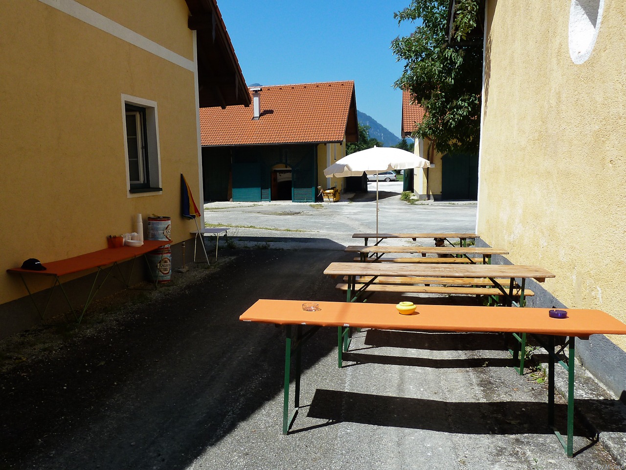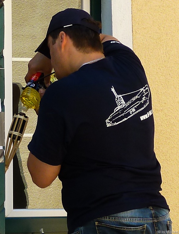 Der Samstag Morgen überrascht uns sehr positiv: Sonnenstrahlen blinzeln uns entgegen. Volker, Kurt und ich beginnen mit den ersten Vorbereitungen. Wir stellen die Bänke auf, richten die Sonnenschirme, positionieren unsere Spendenkassa und bereiten die Fackeln vor.