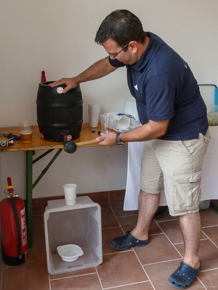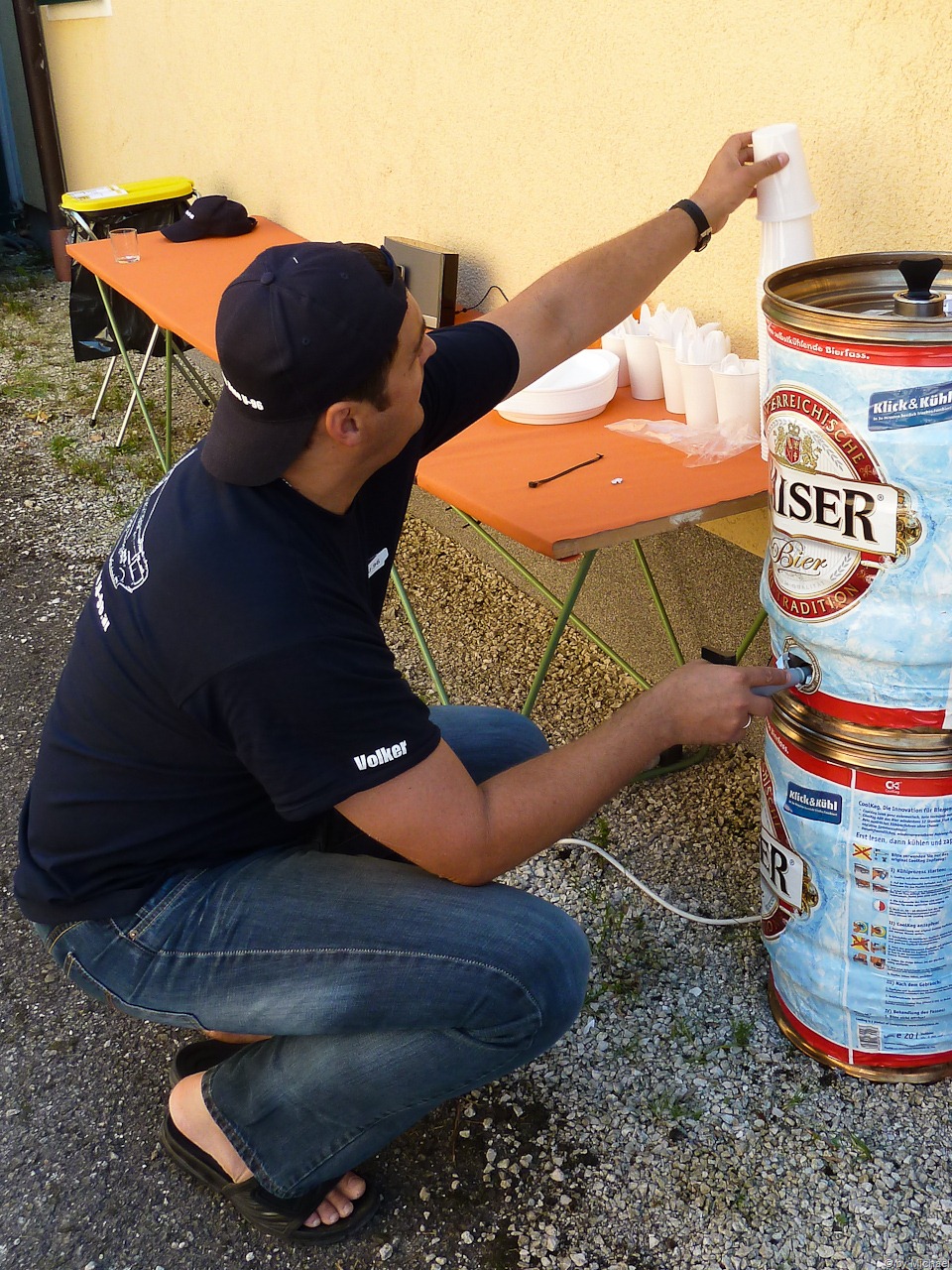 12:00 Uhr die Kühlung des ersten Fasses und lassen ihm eine Stunde Zeit zum kalt werden. Dann ist es soweit und Volker zapft das erste Bier.