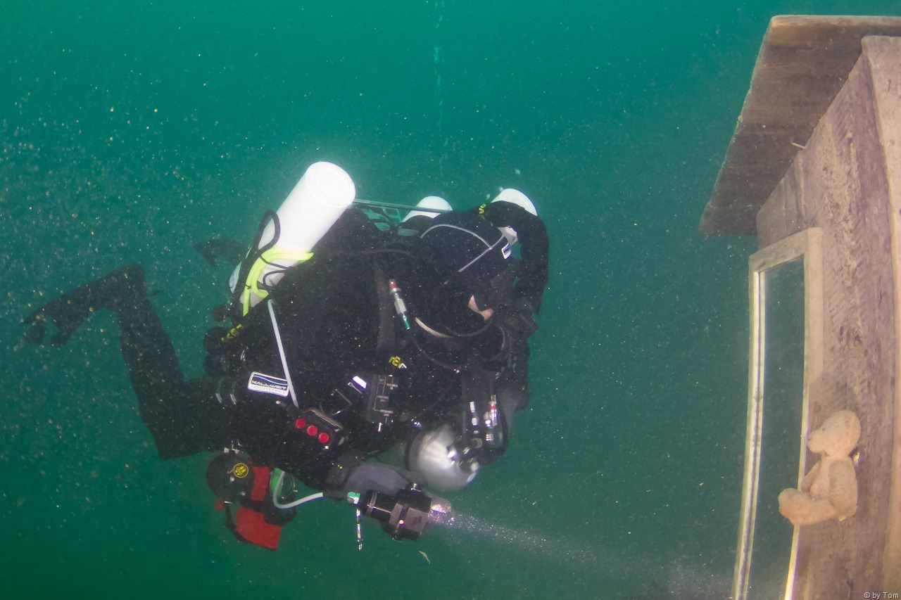 Wir fahren gegen 10:30 Uhr zum Kohlbauernaufsatz, der seit kurzem wieder baustellenfrei ist und richten unser Tauchgerödel zusammen. Tom ist so nett, wieder zu fotografieren.