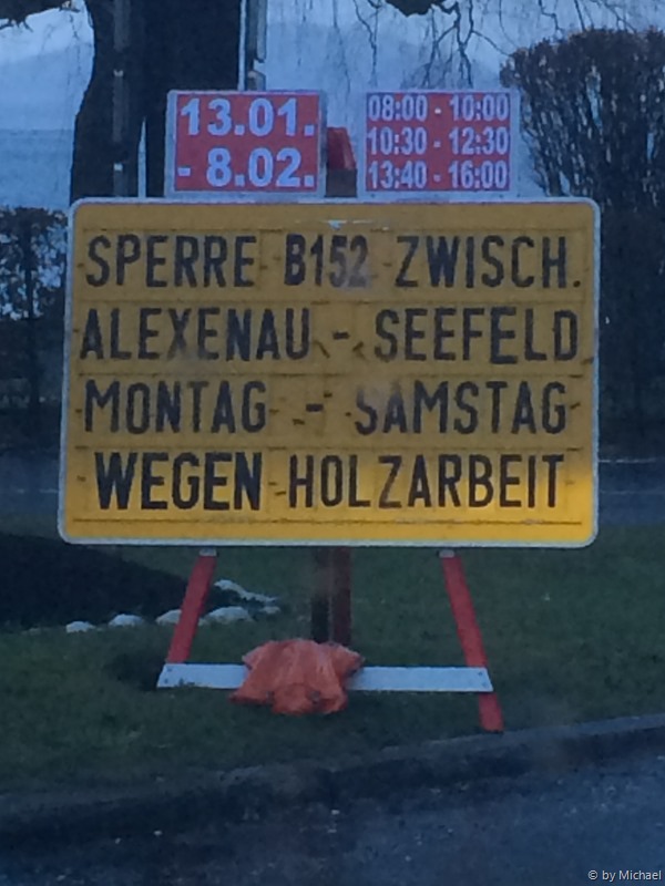 Von 13.01.2014 bis 08.02.2014 werden am Ostufer des Attersees Holzarbeiten entlang der B152 zwischen Alexenau und Seefeld durchgeführt und in diesem Zuge die Straße tagsüber gesperrt.