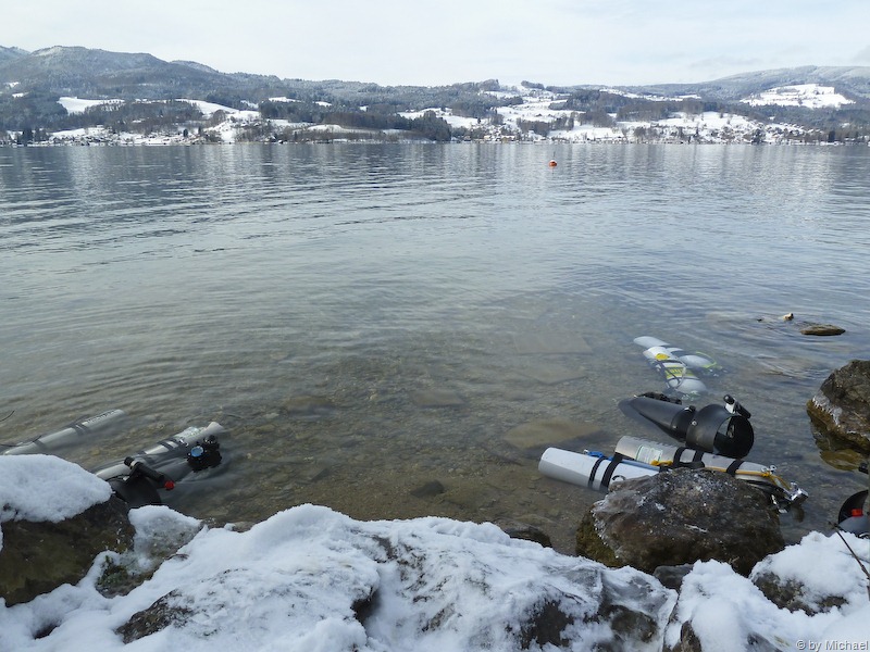 Heute steht ein Tauchgang zum U-Boot am Attersee mit Volker und Christoph am Programm. Das Wetter ist mit -9°C ziemlich kalt, aber die Sonne strahlt freundlich vom blauen Himmel.