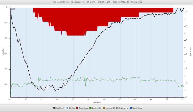 Wir planen die Grundzeit mit 25 Minuten, um den Tauchgang nicht länger als 60 Minuten werden zu lassen. Es wird uns jedoch nicht ganz gelingen.