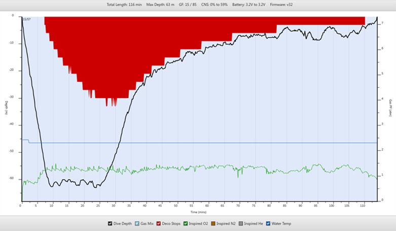 Wir verbringen diese hin und her pendelnd im Bereich der Plattform beim Ausstieg. Ich erhöhe dabei meinen ppO2 auf 1.45 Bar, um etwas schneller aus dem Wasser zu kommen, da mir sehr kalt wird – vor allem in den Fingern durch das Fotografieren. Außerdem hätte ich heute morgen doch vernünftig Frühstücken sollen, das macht sich jetzt bemerkbar!